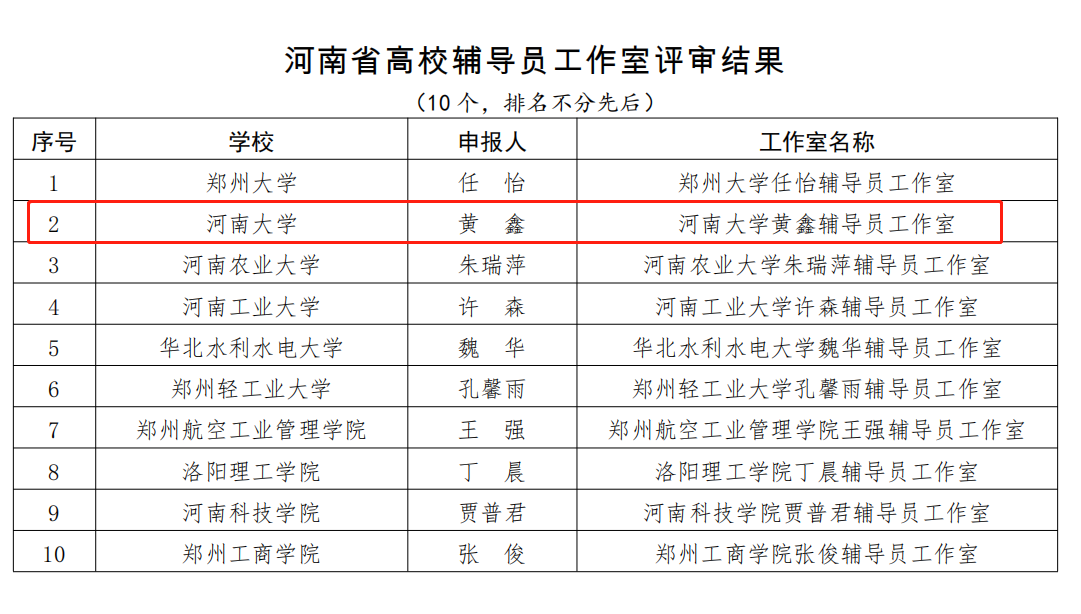 近日,河南省委教育工委、河南省教育厅公布《关于河南省高校辅导员工作室评审结果的公示》,我校党委学生工作部组织申报的“环球手机在线登陆入口黄鑫辅导员工作室”榜上有名。此次评选活动自今年7月启动,经各高校申报、资格审查、专家评审、综合评议等环节,评选出10个河南省高校辅导员工作室。