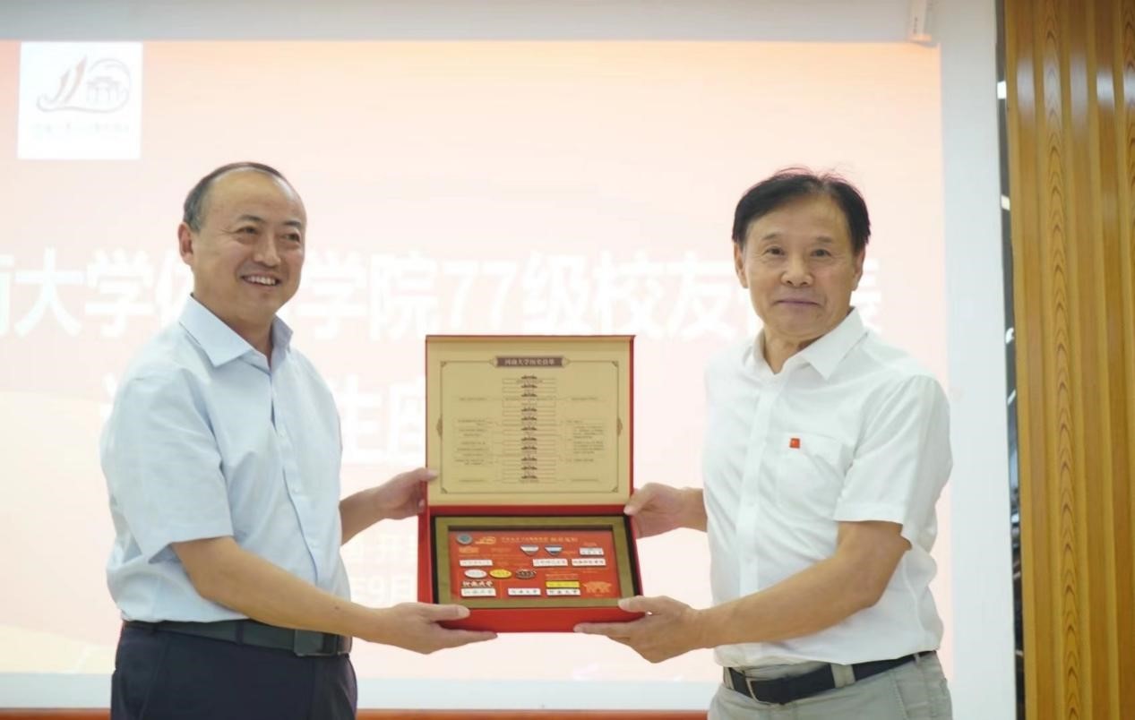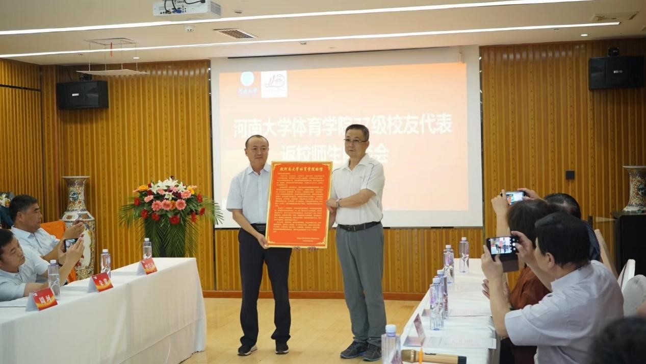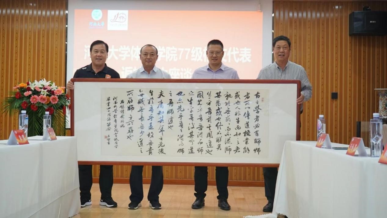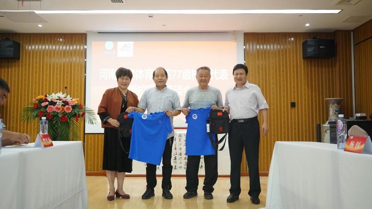 校友河南省体育局原副局长张跃敏、开封市教育体育局原副局长杨钊代表77级校友向体育学院赠送书法作品《师说》,感念师生情。校友郑州大学体育学院(校本部)原院长林克明、河南财经政法大学体育学院原院长崔伟和信阳师范学院体育学院原院长王小美向老教师们献上鲜花并赠送印有专门LOGO的纪念衫、纪念背包。段廷良代表体育学院向77级校友代表赠送环球手机在线登陆入口110周年校庆专属纪念品徽章。