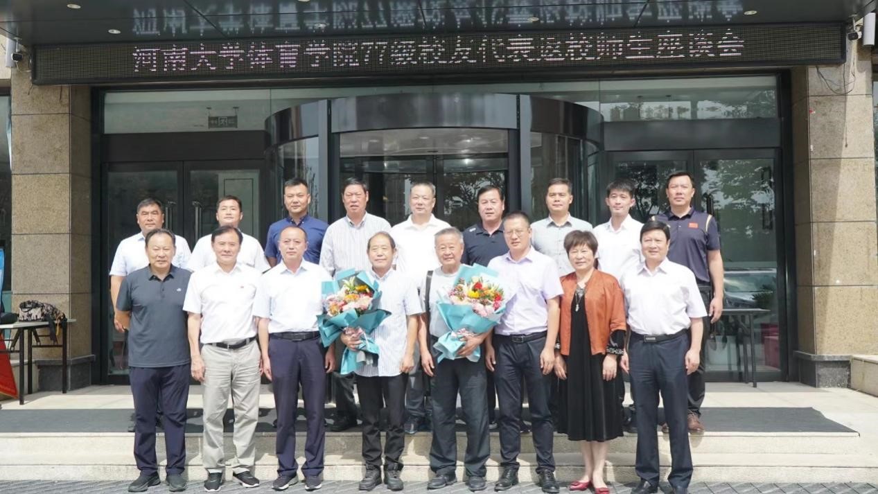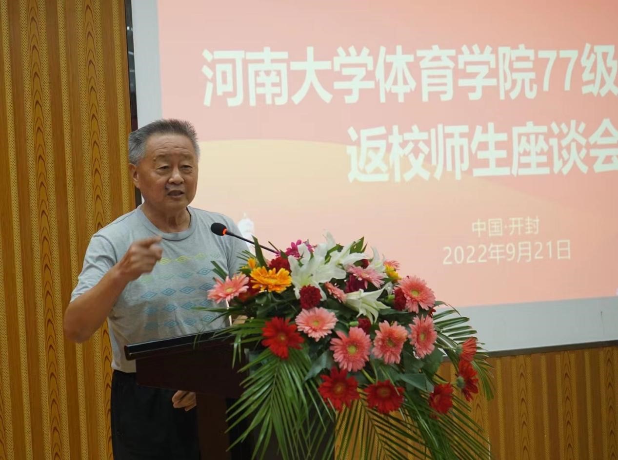 会议伊始,体育学院党委书记段廷良对在座老教师、校友表示热烈欢迎。他谈到,77级校友如今在河南省乃至全国的体育事业的各条战线上作出了突出贡献与成就,是铁塔体育人的榜样,是母校的光荣与骄傲。同时他对体育学院建校以来所培养的两万三千余名学子表达了欢迎和感谢,感谢他们对学校和学院的持续关注,欢迎大家常回母校看看。体育学院院长周珂同老教师和校友们回顾了体育学院自成立以来的发展历程,对校友在学院发展过程中汇聚力量、心系母校的情怀表达敬意与感谢。他表示,河大体育人将继续坚守以学生全面发展为中心、以学术自由发展为宗旨的基本教育理念,为国家培养出更多更优秀的体育人才。