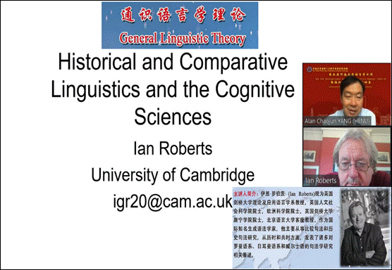 Ian Roberts现为英国剑桥大学理论及应用语言学系教授,英国人文社会科学院院士,欧洲科学院院士,英国剑桥大学唐宁学院院士,北京语言大学客座教授。作为国际知名生成语法学家,他主要从事比较句法和历史句法研究,从历时和共时方面,发表了诸多对罗曼语系、日耳曼语系和威尔士语的句法学研究相关著述。本场第一讲的题目是“现代历史和比较语言学及认知科学(Modern Historical and Comparative Linguistics and Cognitive Science)”。在本讲中,Ian Roberts教授首先指出历史和比较语言学绝对是认知科学的核心。随后,Ian Roberts教授讨论了现代认知科学、传统和现代历史语言学、比较语言学,并引入了对语言学历史的反思,最终得出结论,不仅当代生成语言学没有“黯然失色”(正如Boden 2007在她的认知科学史中所建议的那样),它实际上是提供了一种新的思想综合,将语言学中两个古老的传统结合在一起。