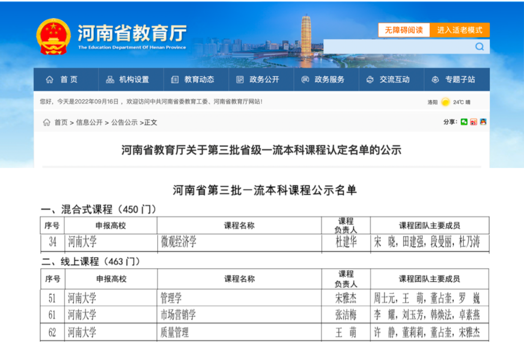 9月14日,河南省教育厅发布了关于第三批省级一流本科课程认定名单的公示。环球手机在线登陆入口商学院共有4门课程获得认定,其中,混合式课程1门:《微观经济学》,线上课程3门:《管理学》、《市场营销学》、《质量管理》。这是继《财务管理》(2020年度)获批国家一流课程、《会计学》、《人力资源管理》、《跨境电商1210模式虚拟仿真实验》(2021年度)获批省级一流课程认定之后,学院在一流课程“双万计划”建设方面取得的又一项优异成绩。
